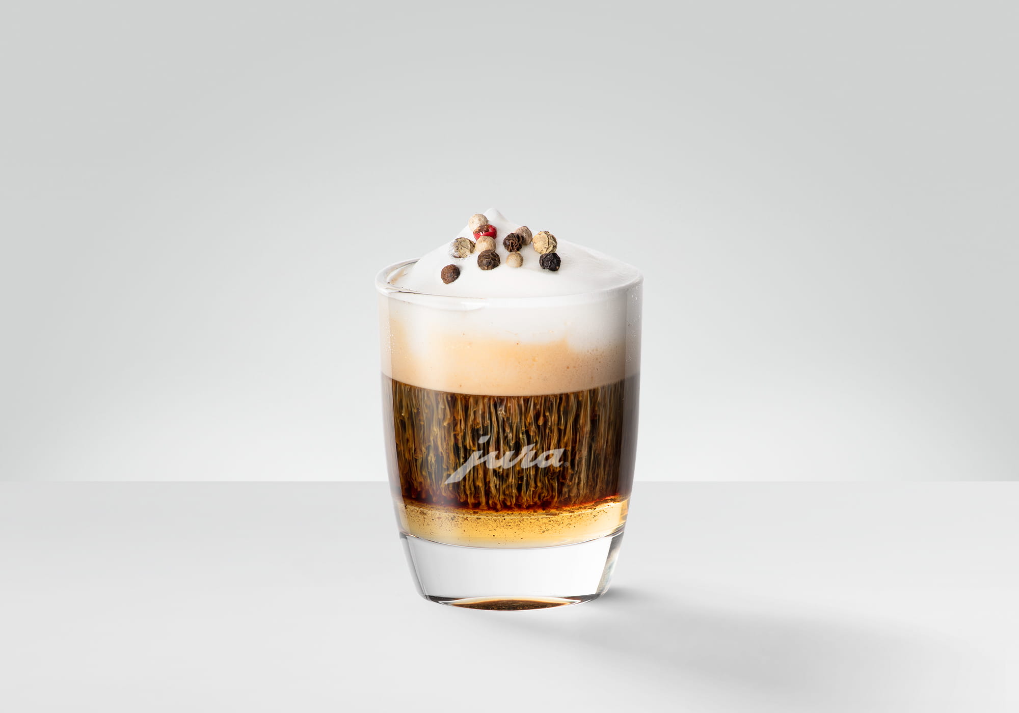 Decoreer de koffiespecialiteit met een snufje peper. Tip: roer het de drank goed om voor u hem drinkt.