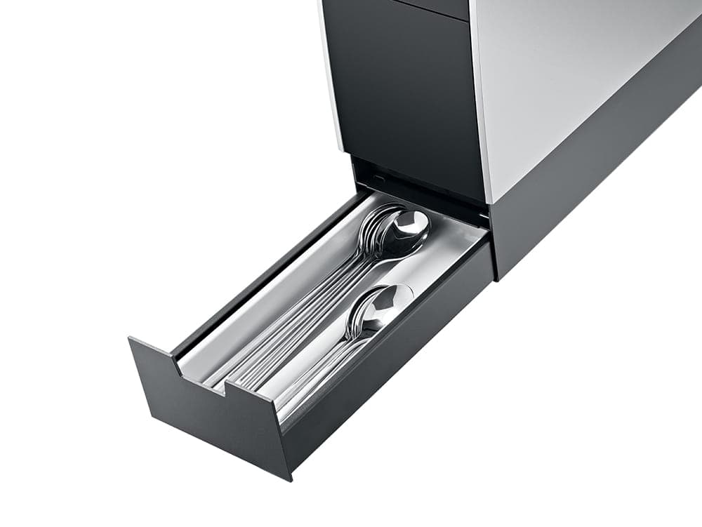 Dankzij de nieuwe accessoirelade sluit de kopjeswarmer perfect aan op de hoogte van de volautomaat. Het extra vakje biedt bovendien meer opslagruimte voor koffielepels van verschillende grootte.